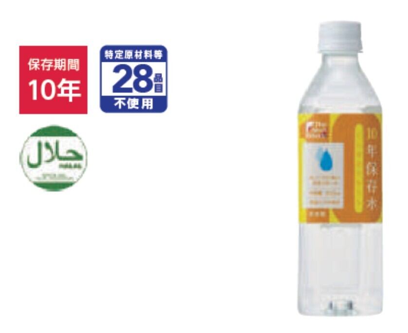 次の10年を見据える10年保存水。安全性を追求し、99.9%不純物を取り除いた、超長期保存水。 24入/約520g(本体)/ 約W60×D60×H210㎜ 生産国/日本